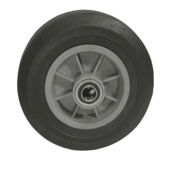 Su banda de rodadura en goma sólida (Solid Rubber Tread) combinada con un rin plástico resistente y rodamientos de bolas (ball bearing) garantiza un desplazamiento suave, silencioso y de bajo mantenimiento. Gracias a su hub desalineado (Offset Hub) y eje de 5/8”, se adapta fácilmente a equipos utilitarios o de transporte que requieren movilidad constante.