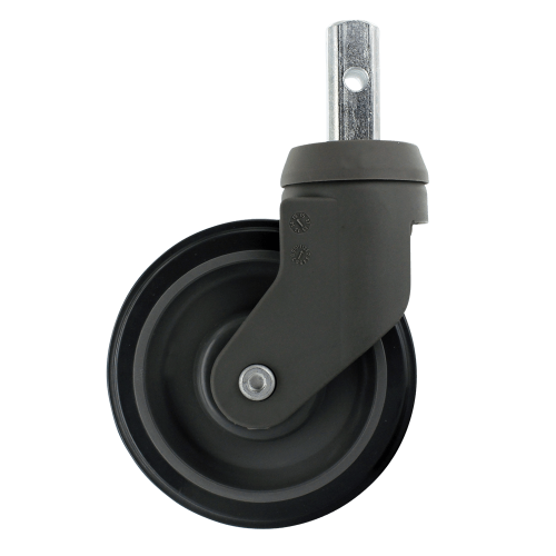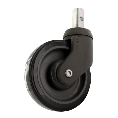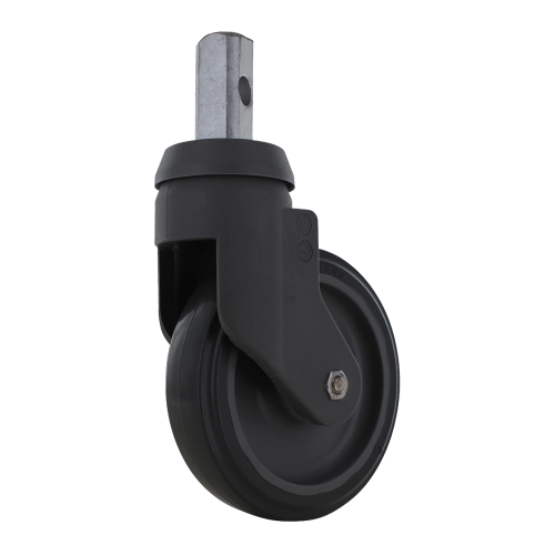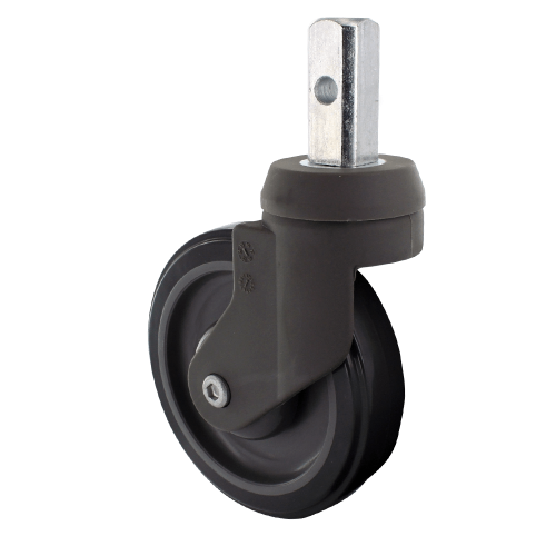 Base giratoria espiga cuadrada en plástico con rueda poliuretano 5” x 1-1/4” con capacidad 250 lbs. por rueda.